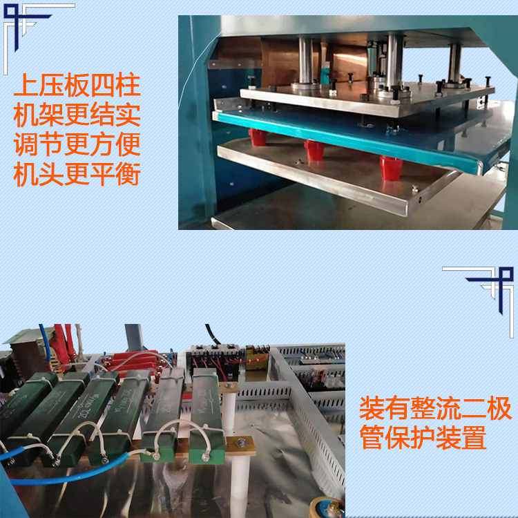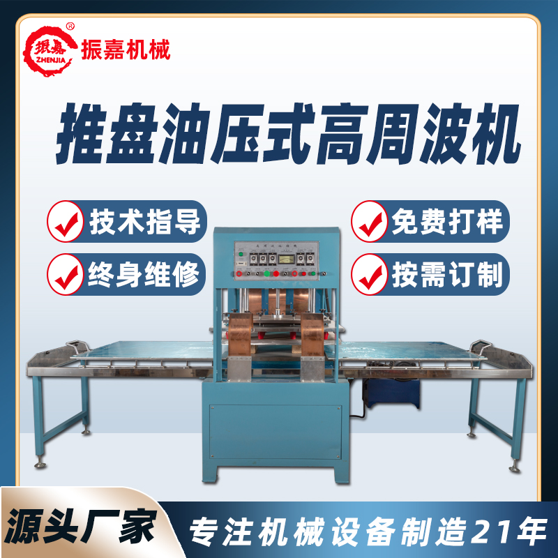 1.推盘油压式高周波机型号为ZJ-15K-SB,此机装有5557防火花保护装置,对高周波模具及生产产品起到很大的保护作用,可以把模具打火机率降低95%。这是一款左右推盘油压式高周波机,可以1个人或者2个人操作,效率很高。