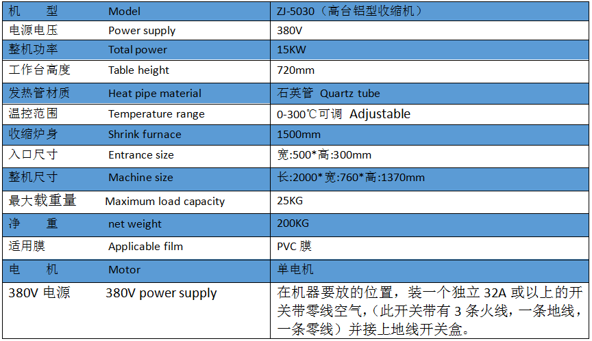 1: 适合铝型材单支或多支套收缩膜后收缩包装。